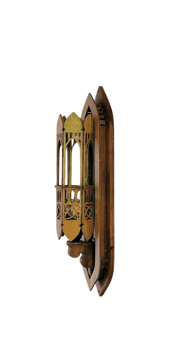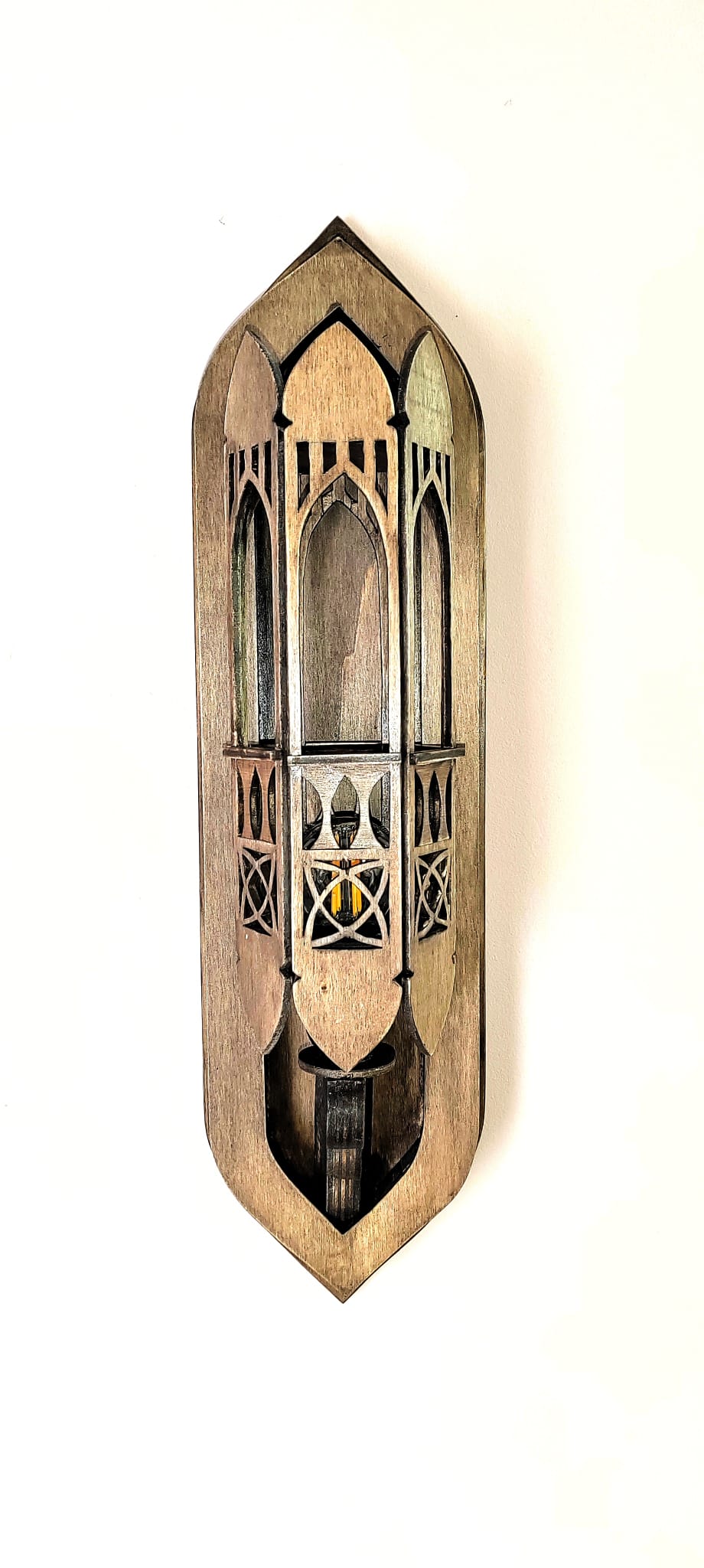 Design arhitectural: Aplica are forme inspirate de stilul gotic, cu ferestre arcuite și detalii geometrice sculptate pe suprafața cadrului. Aceasta amintește de elementele arhitecturale medievale, adăugând o notă de eleganță și mister.