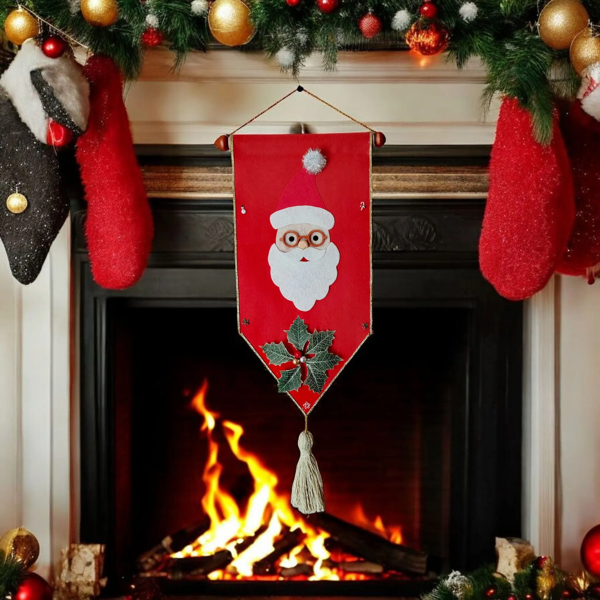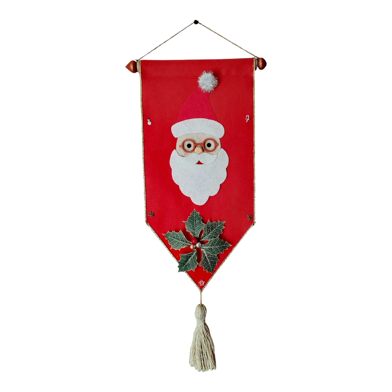 Adaugă un strop de magie sărbătorilor cu această decorațiune de Crăciun din fetru, realizată cu atenție la detalii și finisaje elegante. Bannerul roșu din fetru este decorat cu un simpatic Moș Crăciun cu ochelari, pălărie roșie și barbă albă pufoasă, simbol al bucuriei și generozității. În partea de jos, frunzele de ilex cu bobițe roșii completează perfect aspectul tradițional de Crăciun, iar ciucurele din sfoară adaugă o notă rustică și naturală.
