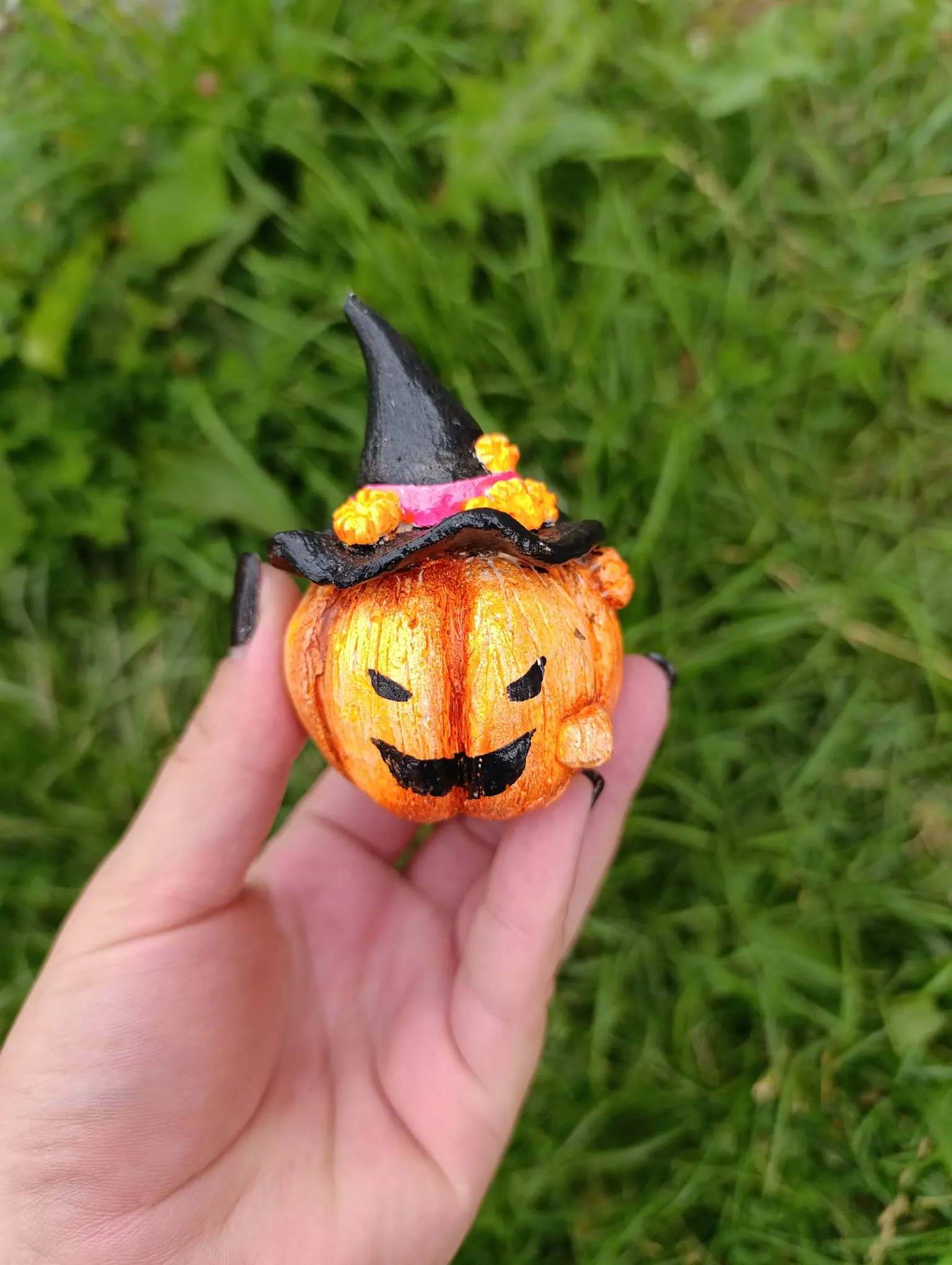Dovlecel portocaliu cu față fioroasă și pălărie de vrăjitoare 🦇 – decorațiunea handmade din gips, pictată manual, care adaugă mister și farmec în decorul tău de Halloween.
