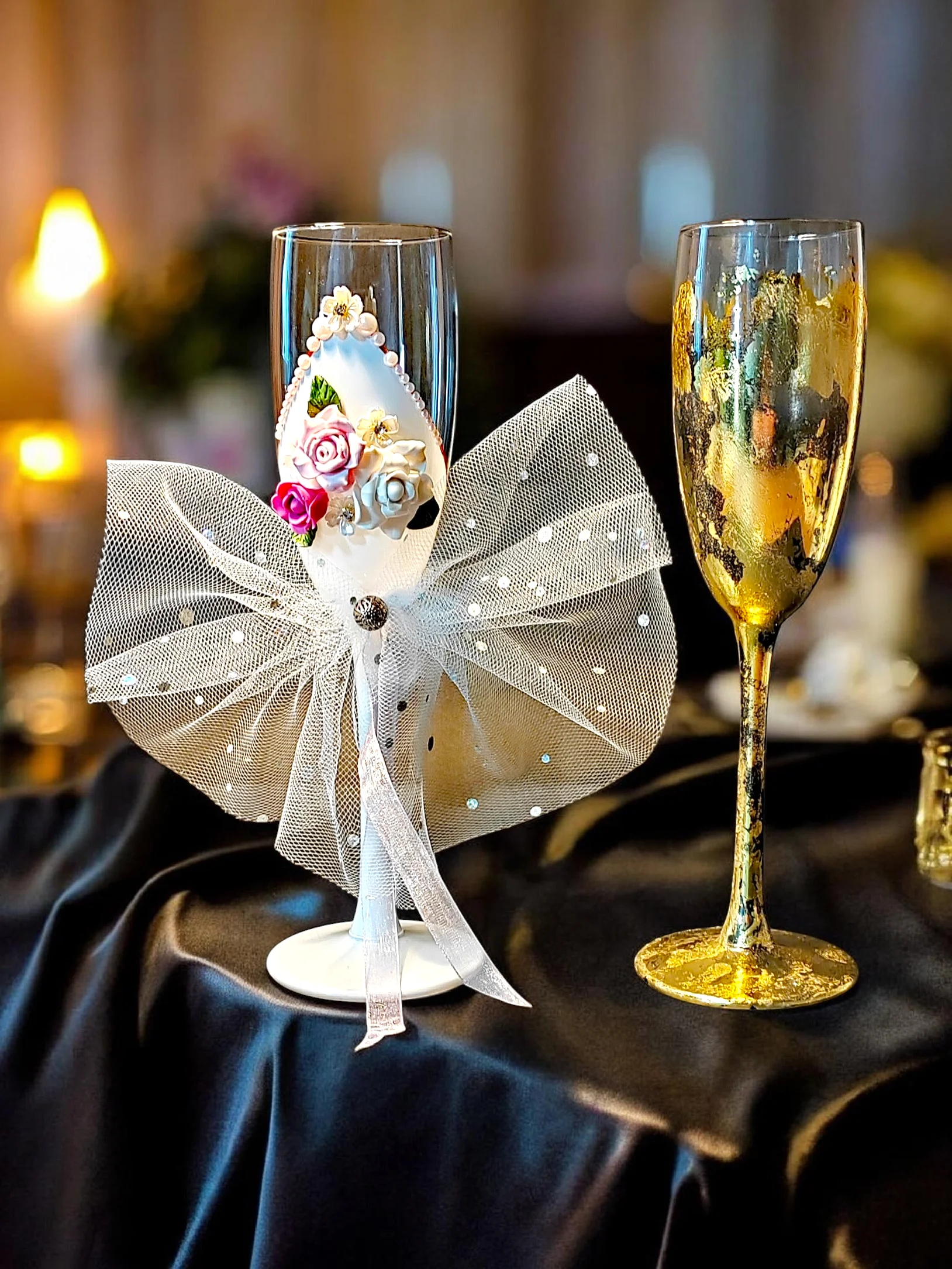 Redescoperă rafinamentul printr-un set de pahare de nuntă lucrate manual, unde arta se întâlnește cu emoția. Fiecare piesă prinde viață prin detalii minuțioase: trandafiri din lut polimeric modelați petală cu petală, finețea tulle-ului, strălucirea perlelor și textură prețioasă de foiță de aur.